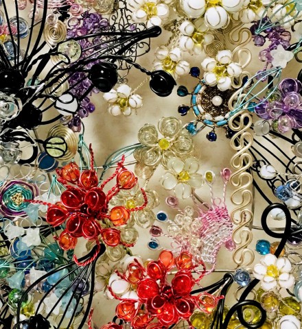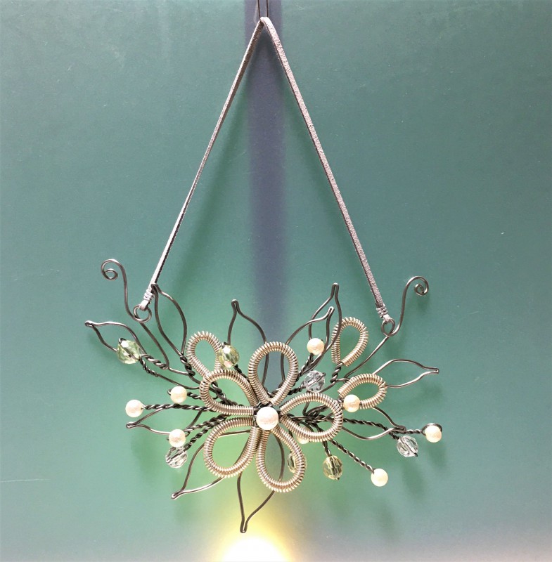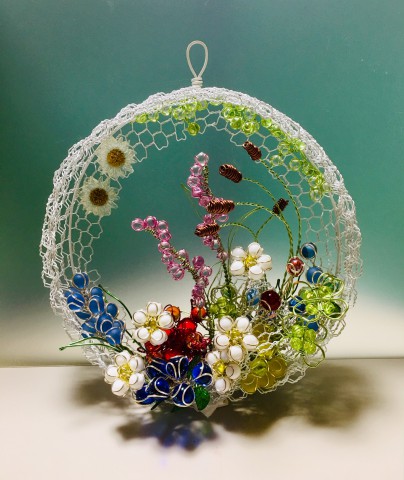 E.「ワイヤーフラワー壁掛け」:ビー玉を使わないワイヤーの作品です。