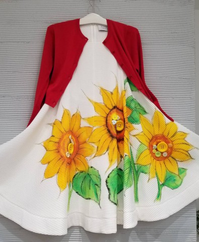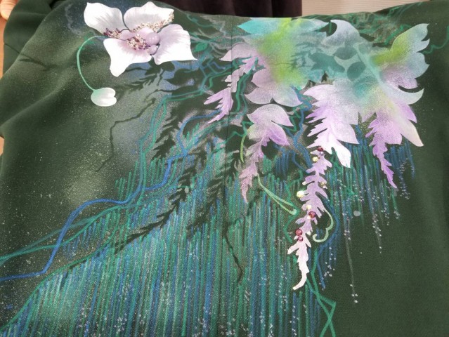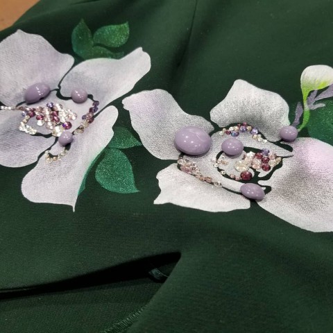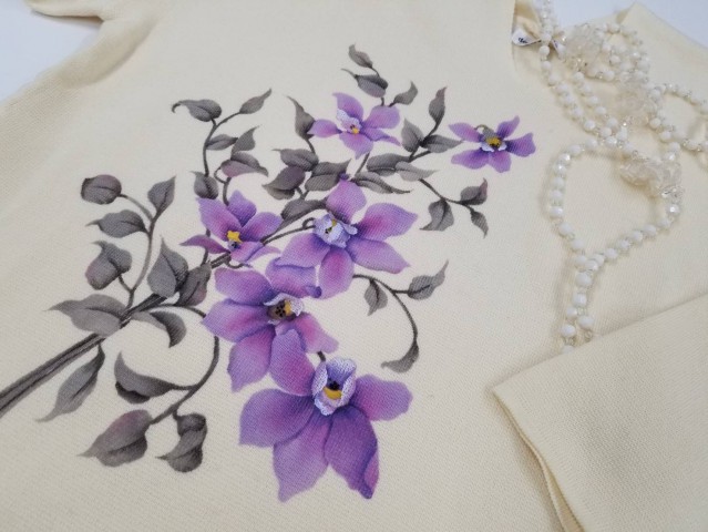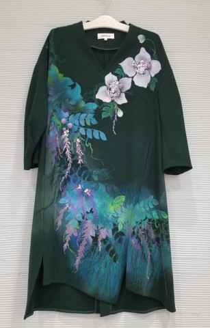 様々な素材のお洋服に型を使い、色々なデザインを描き入れたお洋服を展示しています。ファブリックステンシルとは、お洋服をおしゃれに描いて着るホビーです。写真のように写実的にもアートにも描くことができます。