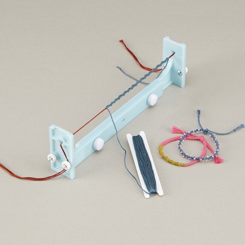「ブレスレットメーカー」は、たて糸を張って、そのたて糸に別の糸を結んだり織ったりしてブレスレットが作れる商品です。