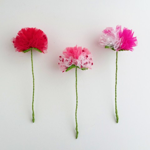 オーガンジー生地とチュール生地をスーパーポンポンメーカーに巻いて、かわいいカーネーションが作れます。