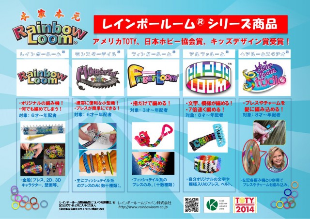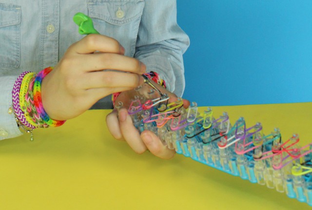 レインボールーム®にさまざまな色の輪ゴムをはめ込み、専用のフックを使用して輪ゴムを編み込んでいくことによって、 自由な発想でとっても楽しいオリジナルのブレスレットを制作することができます。今では米国の他、世界中の子供たちはもちろん、大人の間でもとても人気となっています。