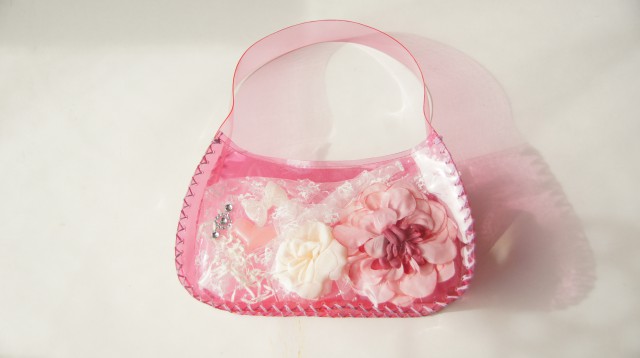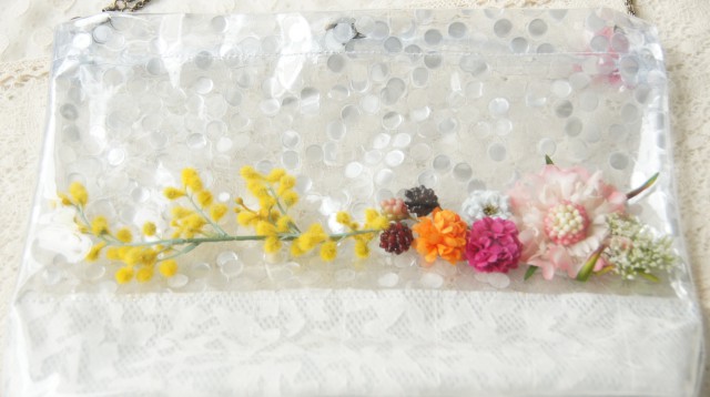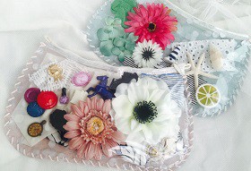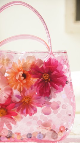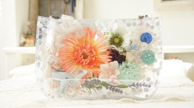ビニールの中にアーティフィシャルフラワー(造花)や輸入ボタン、レース、布、引き揃え糸、スパンコール、パール、ビーズ、貝殻、プラパーツ、ストーン、クマちゃんなどなど様々な材料をデザインし閉じ込めて作る世界に1つのオリジナルバッグ。
