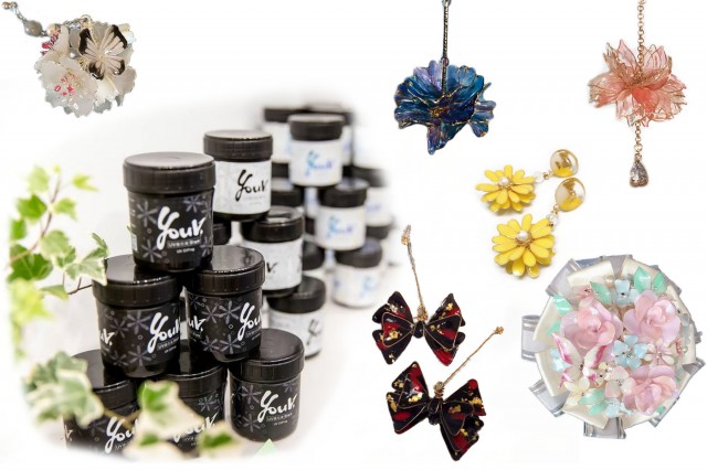UVレジンには、硬化後に硬くプラスチックのようになるハードタイプと、硬化後も折り曲げられるほどの柔らかさの残るソフトタイプがあります。硬化後は、カットや切削、穴あけ、研磨などを簡単な道具や工具で形成することができますからさまざまな作品の制作に使うことができます。 また、手触りがとてもいいのが特徴です 二つの種類のうちの、弊社は、ソフトタイプのレジンに力を入れており、その特性を生かして、自由自在にカットできる点や、オリジナルのパーツを作れる点で人気があります。 また、溶剤を使用していないので皮膚に刺激が少ない商品となっております。 ぜひ、お気軽にお立ち寄りください。